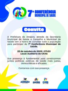 A cidade de Amparo se prepara para sediar a 7ª Conferência Municipal de Saúde, marcada para a quarta-feira dia 22 de outubro de 2025, a partir das 7h30, no auditório do CRAS (Centro de Referência de Assistência Social).