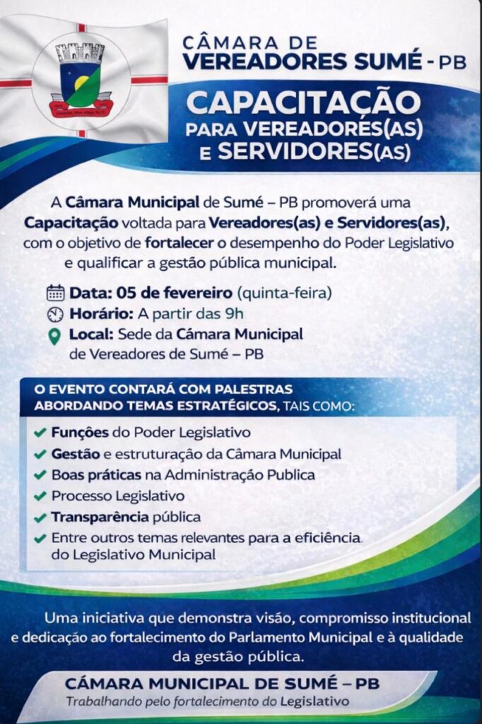A Câmara Municipal de Sumé – PB promoverá, no próximo dia 05 de fevereiro (quinta-feira), uma capacitação voltada para vereadores(as) e servidores(as), com o objetivo de fortalecer o desempenho do Poder Legislativo e aprimorar a qualidade da gestão pública municipal. O evento será realizado a partir das 9h, na sede da Câmara Municipal de Vereadores […]
