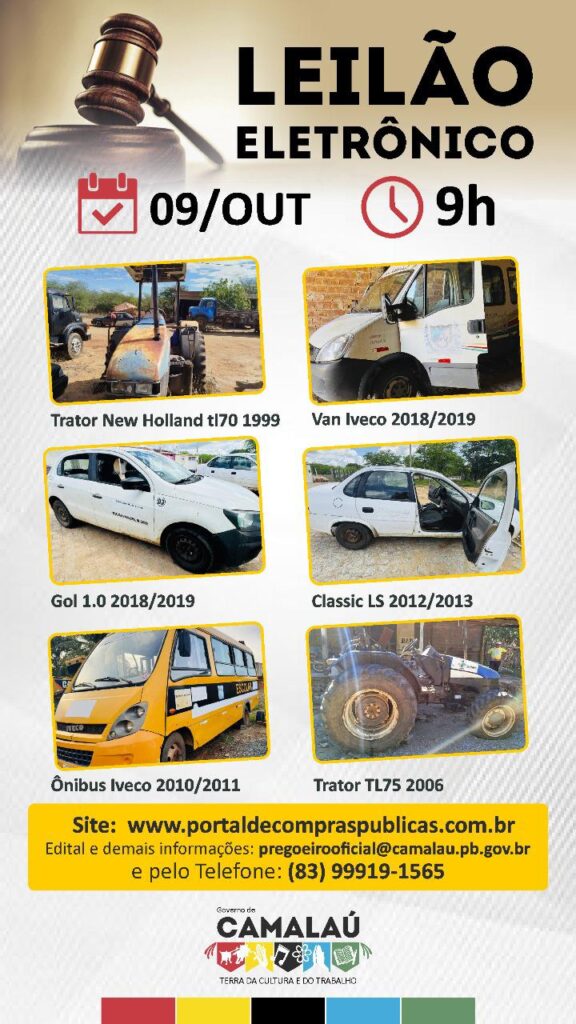 O município de Camalaú, situado no Cariri paraibano, realizará no próximo dia 09 de outubro, a partir das 9h, um leilão eletrônico com diversos bens inservíveis disponíveis para arremate. O leilão é o formato para dar destinação transparente e legal a a bens que já não atendem plenamente às demandas da gestão. O certame será […]