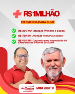 O município de Sumé foi contemplado, com o anúncio de mais de R$ 1 milhão em recursos destinados à saúde e ao fortalecimento da zona rural. A conquista é fruto da articulação do presidente da Câmara Municipal, Jeffeson Menezes, através do deputado federal Luiz Couto.