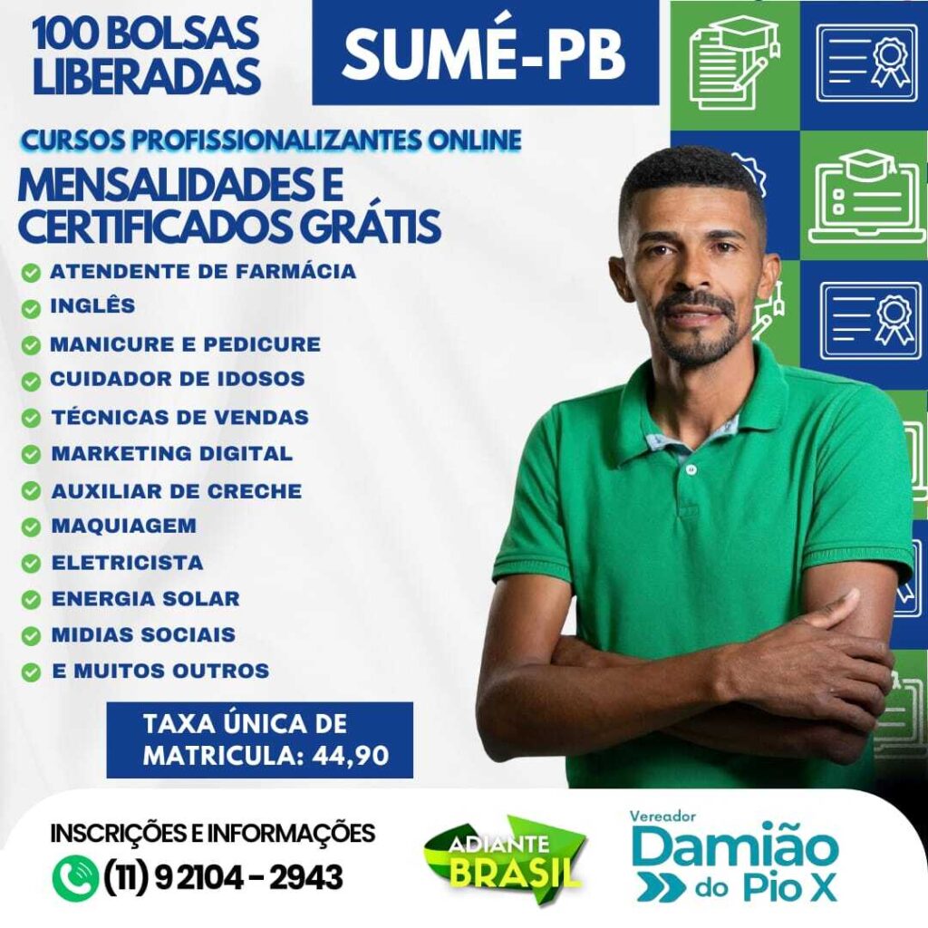 Por meio de uma parceria com o Programa Adiante Brasil, o vereador do município de Sumé, Damião Rildo está viabilizando o acesso da população a cursos profissionalizantes na modalidade EAD, voltados para jovens e adultos que desejam se qualificar e ampliar as chances de inserção no mercado de trabalho. A iniciativa disponibiliza mais de 120 cursos online, abrangendo diversas […]