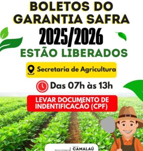 A Prefeitura de Camalaú informa aos agricultores do município que os boletos do Programa Garantia-Safra, referentes à safra 2025/2026, já estão liberados.