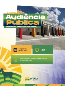 A Prefeitura Municipal de Prata promoverá, na próxima terça-feira, 04 de novembro de 2025, uma Audiência Pública de Esclarecimento sobre o processo de cadastramento de interessados na permissão de uso dos espaços comerciais do Mercado Público Municipal “Boaventura Alves”, localizado na Rua José Borba Filho, s/n, no Centro da cidade.
